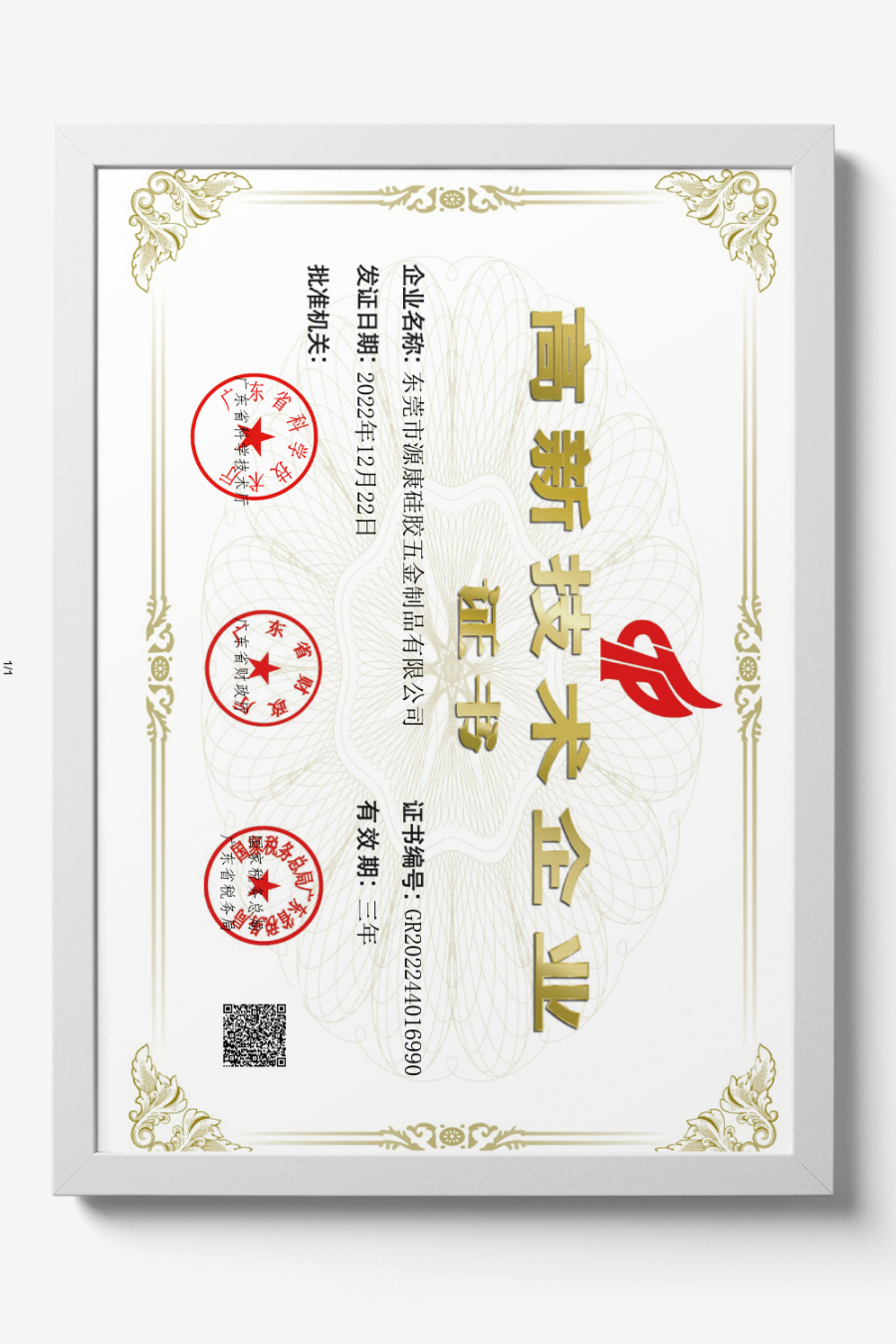 高新技术企业证书