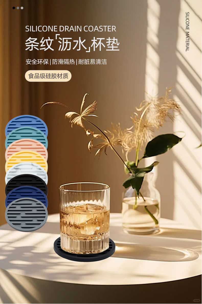 硅胶杯垫 · 防滑隔热 · 沥水快干。蜘蛛网导流纹路:立体条纹加速沥水,告别积水残留,保持桌面干爽。防滑隔热双保障:高弹性硅胶紧贴杯底,防滑不移位;耐高温材质,隔热不伤桌。一冲即净超省心:食品级硅胶抗污耐脏,水洗瞬间恢复如新。柔韧可卷曲:柔软弹性材质,随意折叠不变形,收纳携带超方便。热饮防烫|冷饮防冷凝水| 餐桌必备—为你的杯子配一张会「呼吸」的垫子!