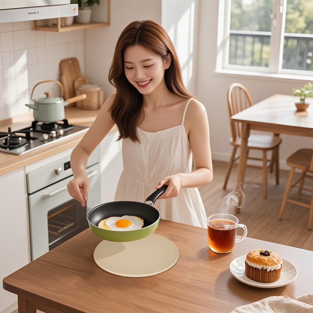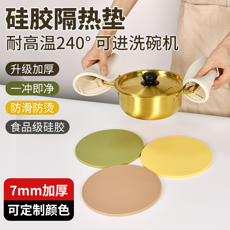 升级加厚硅胶隔热锅垫 | 240℃高温防护 · 一擦即净。加厚防烫设计:3倍加厚硅胶层,耐热240℃不变形,热锅直接放更安心。强力防滑底面:圆形凹槽精准卡位,防滑不移位,保护桌面不留痕。30秒清洁术:油渍水渍一擦即净,可当餐垫/杯垫/厨具垫多功能使用。带走这块会「隐形承托」的圆形防护盾。