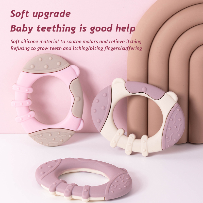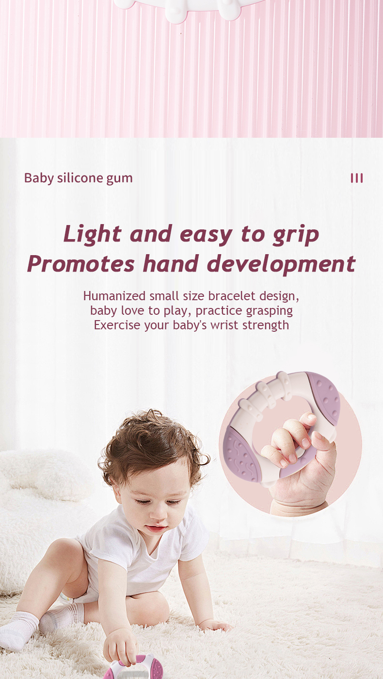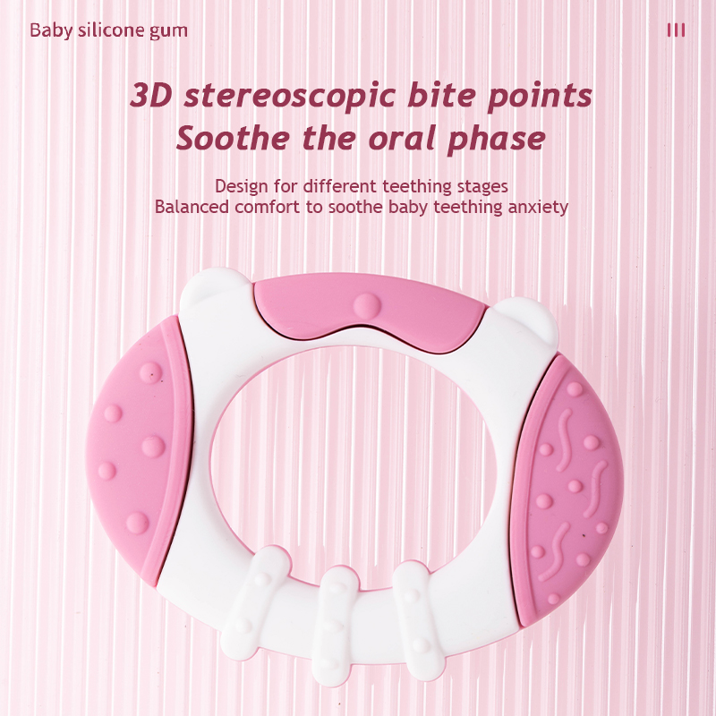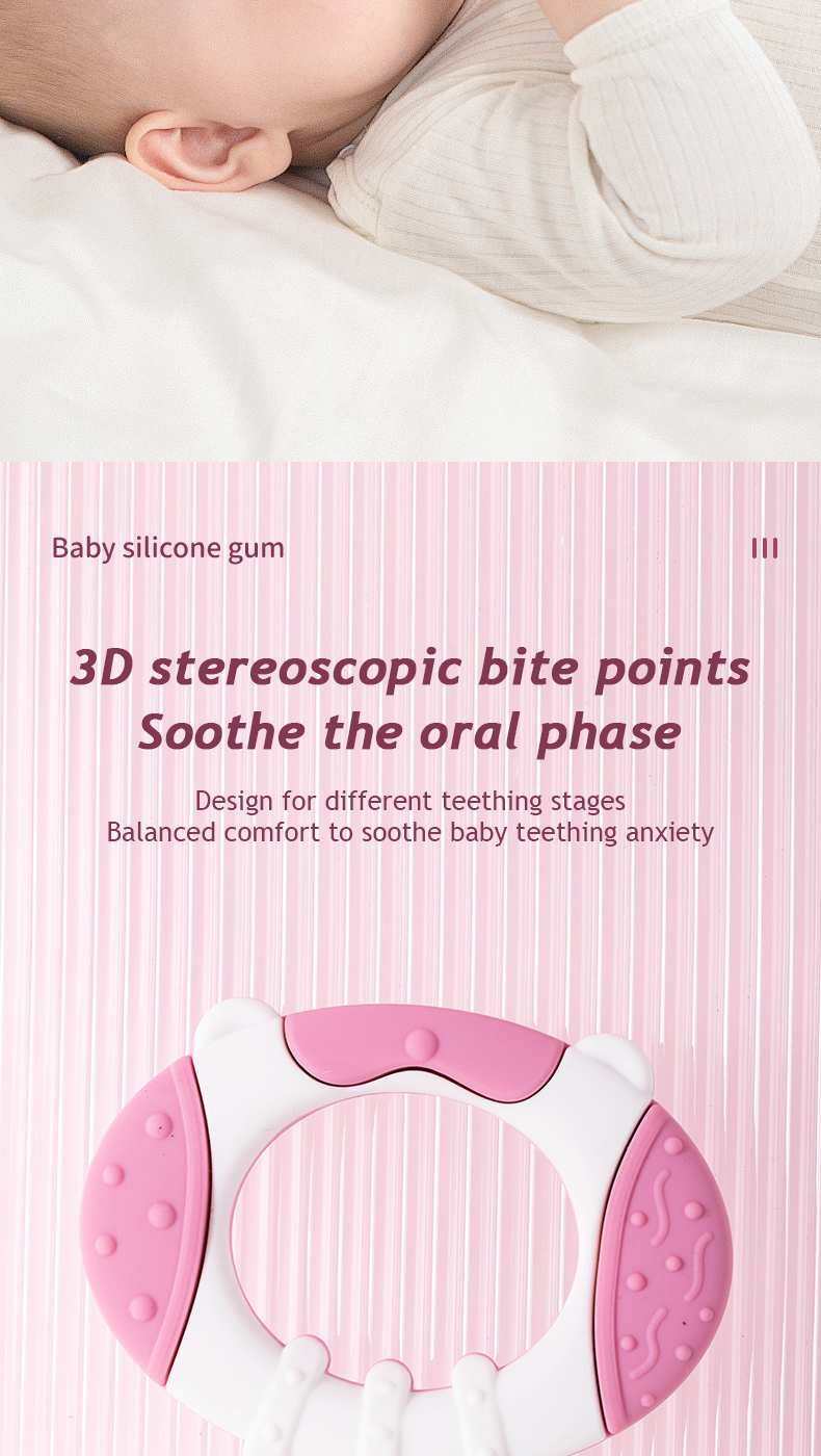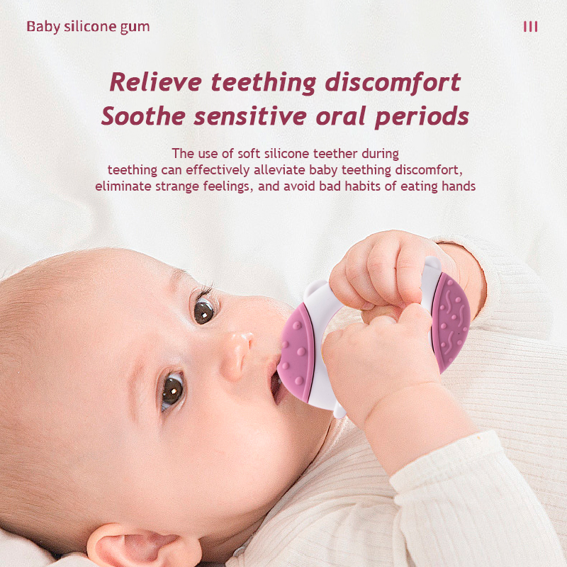 硅胶牙胶咬咬乐——宝宝安心啃咬,妈妈放心选择!专为宝宝设计,食品级硅胶材质,安全无毒,可高温消毒,呵护宝宝健康。3D立体咬合点,科学按摩牙龈,舒缓出牙不适,促进口腔发育。符合安全尺寸,防卡喉设计,搭配易抓握的造型,锻炼宝宝手部协调能力。采用柔和食欲配色,刺激视觉发育,让宝宝爱不释手!从磨牙到抓握,一款满足多重需求,陪伴宝宝快乐成长!